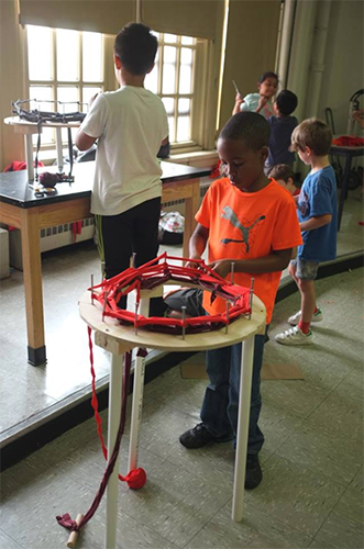 Kids at Beam Summer Day built and used giant knitting machines to create colorful tubular structures out of recycled fabric.